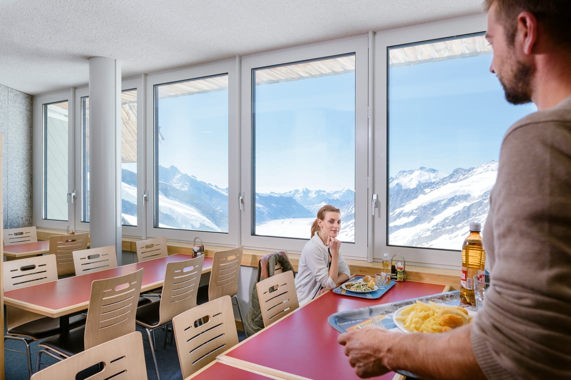Restaurant Aletsch Even the ride on the Jungfrau Railway to the Jungfraujoch will whet your appetite: for the views, for the panorama, for the snow and ice – and for something between your teeth. Mountain air indeed makes you hungry. Restaurant Aletsch is well equipped for small and sometimes even bigger appetites. Take your plate, order a menu, take a seat – then the culinary and high-Alpine experience begins. At these heights, you'll want to try one of the home-made chocolate specialities. Your appetite won't be lacking.